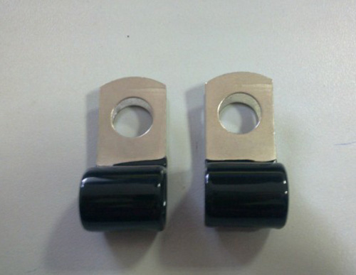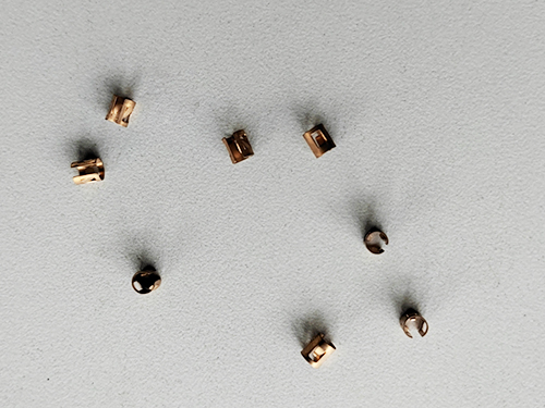 在五金沖壓件剪切截面的某處出現(xiàn)舌狀部分,稱為壓縮毛刺。
